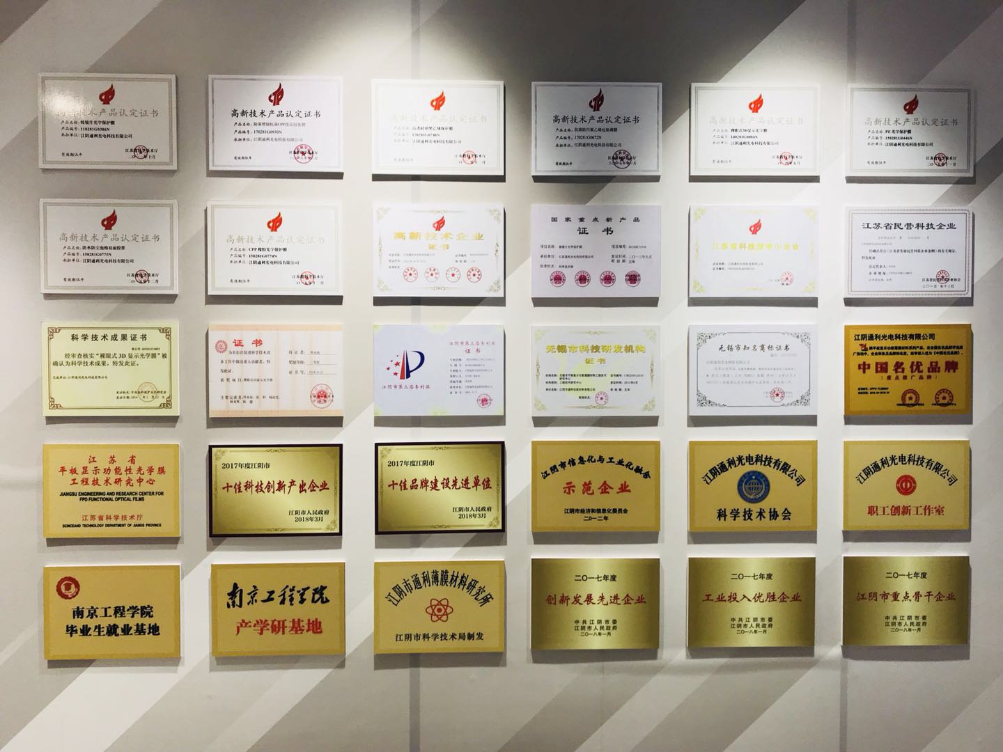 對(duì)工藝改進(jìn)的執(zhí)著探索和對(duì)產(chǎn)品質(zhì)量的極高要求不但為通利科技帶來(lái)了強(qiáng)大的市場(chǎng)競(jìng)爭(zhēng)力,同時(shí)也獲得了市場(chǎng)的肯定,獲得了國(guó)家相關(guān)部門(mén)的認(rèn)可。通利科技現(xiàn)擁有“發(fā)明專利”、“國(guó)家重點(diǎn)新產(chǎn)品”、“科學(xué)技術(shù)成果”、“軟件著作權(quán)”等榮譽(yù),功能性新材料中多項(xiàng)產(chǎn)品被評(píng)為江蘇省“高新技術(shù)產(chǎn)品”,并被列入“國(guó)家火炬計(jì)劃”,2015年公司被評(píng)為“江蘇省高新技術(shù)企業(yè)”。